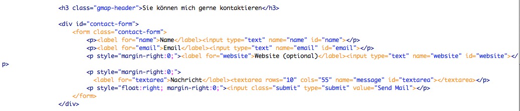 #1 6. Juli 2014 Hallo an alle, ich stehe kurz vor dem Abschluss meines Portfolios. Eines fehlt mir noch - die Einrichtung bzw. das weiterleiten von eMails an meine angelegte Mailadresse. Ich habe alles fertig: Mailadresse eingerichtet, die Weiterleitung vom Server (Strato) an meine angelegte Mailadresse eingerichtet. Eines fehlt noch - wie empfange ich die eMails? Welcher Code fehlt mir noch, damit mir eine Mail geschickt wird, wenn ich auf den Button "Send Mail" drücke? Website:http://matthiasmann-portfolio.de/contact.html Code: <div id="contact-form"> <form class="contact-form"> <p><label for="name">Name</label><input type="text" name="name" id="name"></p> <p><label for="email">Email</label><input type="text" name="email" id="email"></p> <p style="margin-right:0;"><label for="website">Website (optional)</label><input type="text" name="website" id="website"></p> <p style="margin-right:0;"> <label for="textarea">Nachricht</label><textarea rows="10" cols="55" name="message" id="textarea"></textarea></p> <p style="float:right; margin-right:0;"><input class="submit" type="submit" value="Send Mail"></p> </form> </div> Ich bitte um Eure Hilfe, wäre wirklich super! Vielen Dank im Voraus! Liebe Grüße Anhänge: Bildschirmfoto 2014-07-06 um 13.57.33.png Dateigröße: 53,3 KB Aufrufe: 259 + Multi-Zitat Zitieren